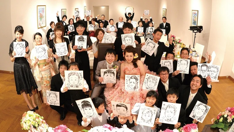 会場に似顔絵師が出向き、数分で似顔絵を描くサービスのこと。結婚式や、宴会など、たくさんの人が集まるイベントの余興のコンテンツとしてご利用されます。モデルになる人はじっとしていなくてもOK。描いた似顔絵はお持ち帰りいただけるので、結婚式の引き出物やイベントの記念にすることも可能です。