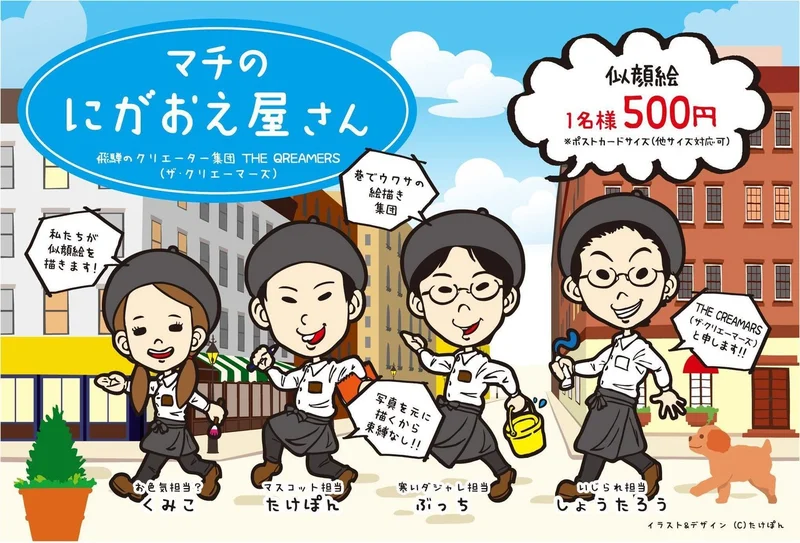 似顔絵の活動は、最初は一個人としての活動でしたが、気づけば仲間が増え、若手作家のチームとなりました。そんな近い境遇の仲間はもちろん、似顔絵を描いたお客さん、会場の関係者、イベンター、出店者とつながることができ、今ではそのご縁からデザインの仕事を依頼されることも。