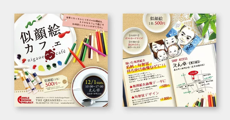 そこで、カフェに出店をしてコーヒーを飲みながら気軽に似顔絵を楽しんでもらうような工夫をしたり、その場で描いた似顔絵を名刺や年賀状などに使えるデータにしてお渡しするといったサービスを提供したりもしました。現場に自ら出向きニーズの調査を行った経験は、今もデザイナーの仕事でとても役に立っています。