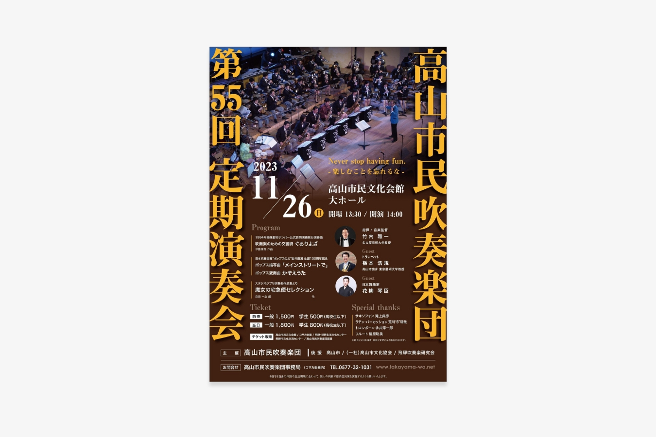 コンサート チラシ・ポスター|高山市吹奏楽団 / 高山市 2025 9/06 グラフィックデザイン #チラシ・ポスター・DM#飛騨エリア 2023年10月1日2025年9月6日 竹本 純 AD・D / 竹本 純 グラフィックデザイン #チラシ・ポスター・DM#飛騨エリア よかったらシェアしてね! URLをコピーしました! 神社 絵馬 イラスト・デザイン|飛騨天満宮 / 高山市 イベント フライヤー・ポスター|HIDA OUTDOOR FREAKS / 高山市・飛騨市 この記事を書いた人 竹本 純 creative studio somel 代表 平成元年生まれ。岐阜県高山市出身。グラフィック・WEB・イラストなど多方面のクリエイティブを学び、地元デザイン事務所に約15年従事。その傍で専門学校の非常勤講師や地域の多様な取り組みに関わる。2025年に独立。田舎暮らしを体現するべく岐阜県飛騨市に移住し、古民家を購入。淡水魚のウグイが好きすぎるあまり「日本ウグイ協会」を設立。一児の父。趣味はラップ。 関連記事 大学 パンフレット デザイン|コー・イノベーション大学(CoIU) / 飛騨市 2025年10月17日 「味付けあげ」パッケージデザイン|みよしや(三好屋) / 東白川村 2025年9月10日 イベント フライヤー・ポスター|HIDA OUTDOOR FREAKS / 高山市・飛騨市 2025年9月6日 市民団体 ランディングページ|HIDA OUTDOOR FREAKS / 高山市・飛騨市 2025年9月1日 「飛高もみじ」アートワーク|HIDA OUTDOOR FREAKS / 高山市・飛騨市 2025年9月1日 市民団体 ショップカード|HIDA OUTDOOR FREAKS / 高山市・飛騨市 2025年8月28日 イベント ポスター・チラシ|一般社団法人 高山青年会議所 / 高山市 2025年8月20日 飲食店 ロゴマーク|レ・グルマン / 高山市 2025年8月10日